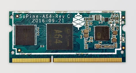 The SOPINE is a compute module powered by the same quad-core ARM Cortex A53 64-bit processor used in the PINE A64 with 2 GB of LPDDR3 RAM memory, power management unit, SPI flash and integrated bootable microSD slot. The module features a SODIMM-DDR3 form-factor and can be paired with either the SOPINE Baseboard, the Clusterboard or a custom host PCB for industrial or other embedded applications.