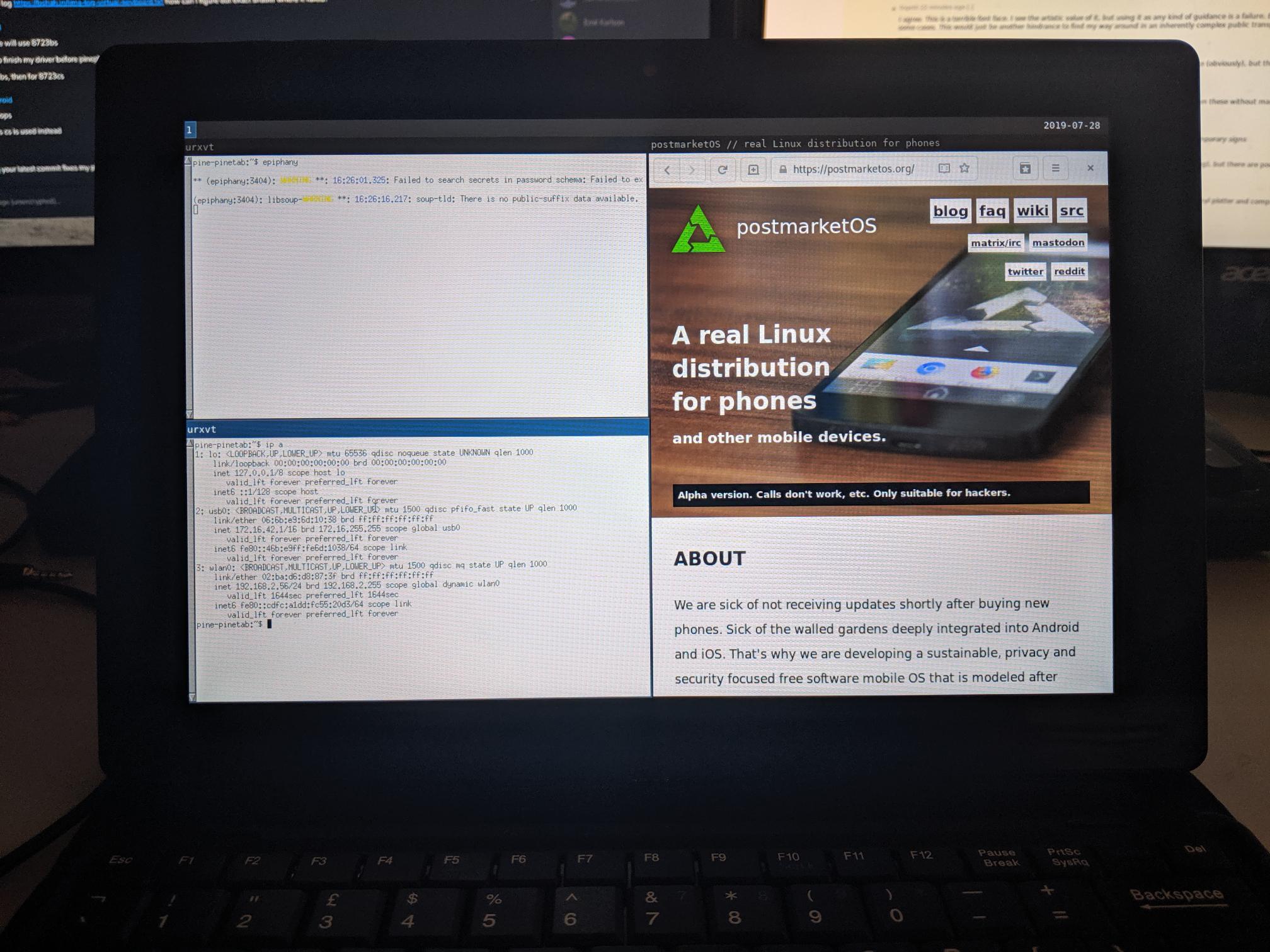 I was really excited to see Martijn Braam from postmarketOS demo the PineTab running a build with the Sway window manager. Watching the video gives you a sense of the sort of interesting experiments that such a laptop-tablet hybrid device opens up. You can see Martijn use the trackpad and keyboard for the usual window manager and terminal stuff, and then switch to the touchscreen to interact with web pages in the browser. Obviously the Sway WM may not be a natural nor a perfect fit for the device, but the option is there for those who only occasionally need the touchscreen functionality and love tiling managers. Moreover, looks like Sway will be getting touch navigation buttons on the top bar, gesture navigation and a virtual keyboard in the foreseeable future - making is a real option. Let’s face it, if tiling WM experience can be enriched by the touchscreen then every other scenario I can think of - perhaps with the exception of running a raw Bash shell - is almost certainly viable. Martijn also has a video showcasing Phosh shell running on postmarketOS. It is very cool to see a work-in-progress front-end crossover from another great FOSS project. I have also seen KDE Plasma and plasma mobile running on the device; I am linking the relevant media below.