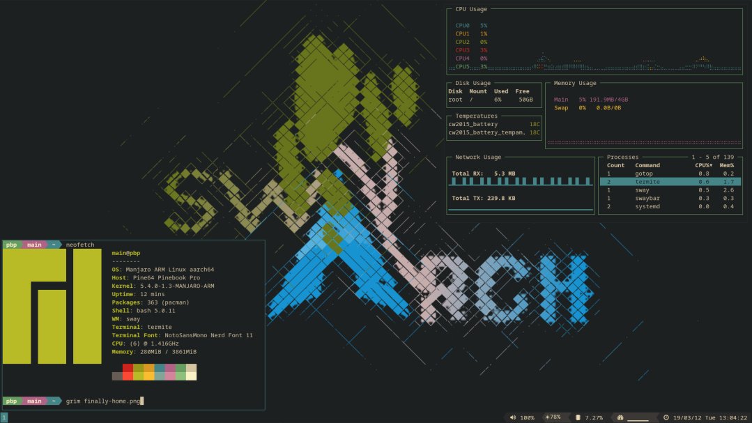 Speaking of OSs available for the Pinebook Pro, their number is steadily growing and new options available for download. The recent month saw the release of Q4OS as well as multiple Manjaro Preview images which run on the mainline kernel. There are also builds of Fedora 31, Kali Linux, Arch and many other OS in the works, that we know you’ll be excited to see running on the Pinebook Pro. I will also mention that over the past month the default Debian with MATE build has seen a lot of improvements, including: boosted performance, new web browsers, increased Firefox performance, significantly enhanced suspend (power consumption in suspend is now 1/10 of original value) and many kernel fixes. You can follow the developments of the default OS build here. The Mainline Linux development is coming along very well and if you are dead set on running a mainline build with Panfrost (FOSS) GPU drivers then I suggest you follow this thread by tsys, which highlights the steady progress of 5.X kernel that is bound to be the basis for all future Linux OSs.
