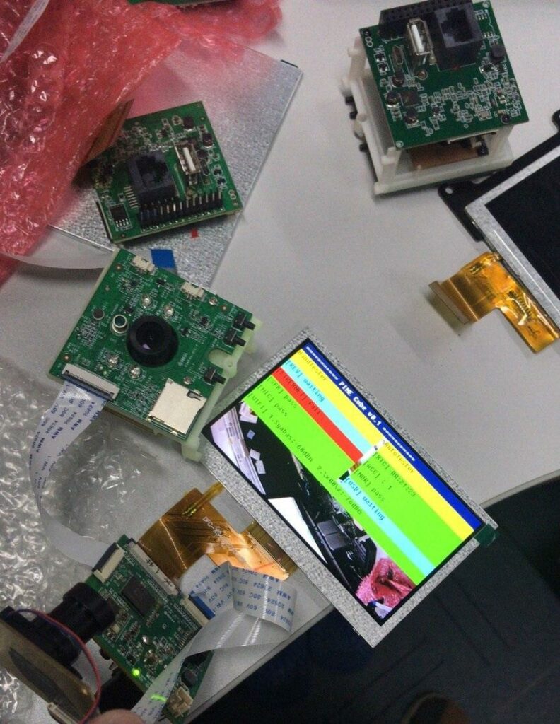 As the name entails the PineCube comes assembled into a small cube. But the device is actually constructed out of 3 PCBA pieces connected via flex cables: the front PCBA (with sensors and IR LEDs), the camera module in the middle and back PCBA (with networking, SoC and GPIO). If required these can be detached from the plastic frame; this is something we imagine can be useful when embedding the device, especially in an industrial or project scenario. I am including a picture of the PineCube pieces detached from the frame and a LCD displaying camera feed and debugging information attached.