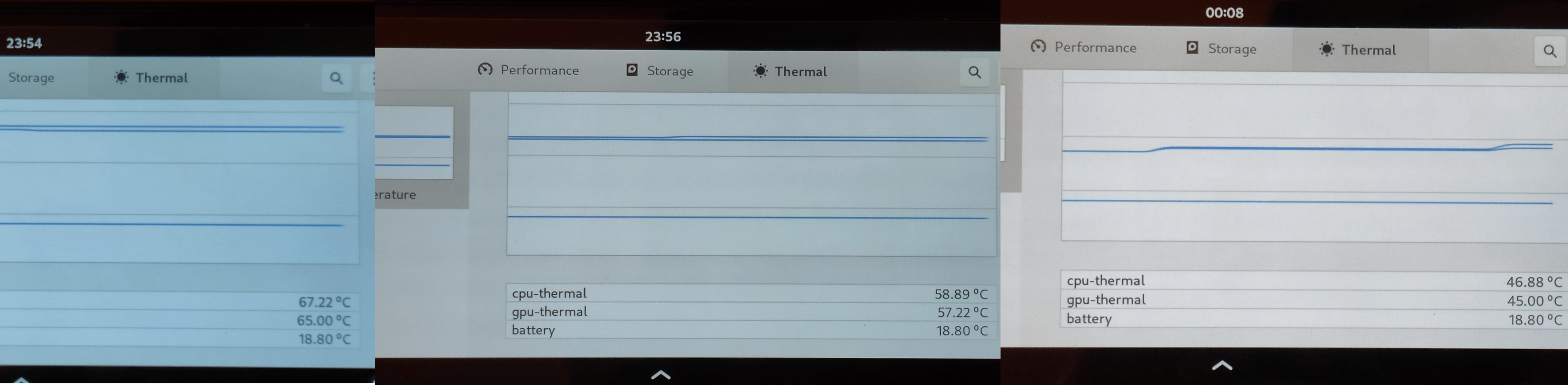 I am also happy to report that my device doesn’t run hot. Warm, circumstantially yes (mostly in the top quarter of the LCD display), but at no point did I feel it reached uncomfortable temperatures. Indeed, it is my impression that the PinePhone Pro runs cooler than the original PinePhone. I verified this with Justine and Phillip (from Manjaro) who also received their PinePhone Pros in recent days. Justine told me that “(..) [it] does run cooler than my previous [PinePhone] even when compiling packages on it”. I also checked the internal temperature of the device after running an artificial load on all cores for 10 minutes - the SoC reached the temperature of, and remained at, approx. 68*C. The temperature dropped to 58*C after a minute of cool-down time. It then hovered at 47*C after 10 additional minutes of inactivity with just the web browser open and the screen on. It appears that ~55*C is the SoC’s average operating temperature when browsing the web, installing packages, etc. and the temperature is dissipated well by the chassis without one spot becoming exceedingly hot. So, in conclusion, the SoC does get hotter than on the A64 on PinePhone, but it doesn’t feel like it to the person using the device.
