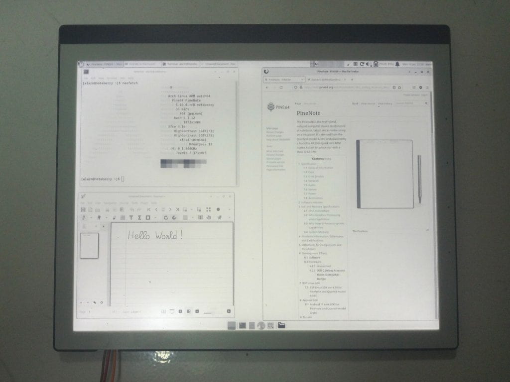 To be clear, the display driver is not yet complete. Currently, it only uses the basic grayscale waveform. More work will be needed to support the optimized anti-ghosting waveforms, the fast monochrome waveform used for low-latency pen input, and the dithering waveform necessary for watching videos. Still, it is exciting to see what people are already doing with the panel. Folks have been working on several desktop environments, including GNOME and XFCE: