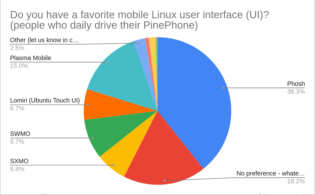 Phosh is by far the most popular UI among those who daily drive their PinePhones with a presence on nearly 40% of all installations. This is more than likely due to Mobian - which features Phosh by default - being a popular choice for daily driving.
