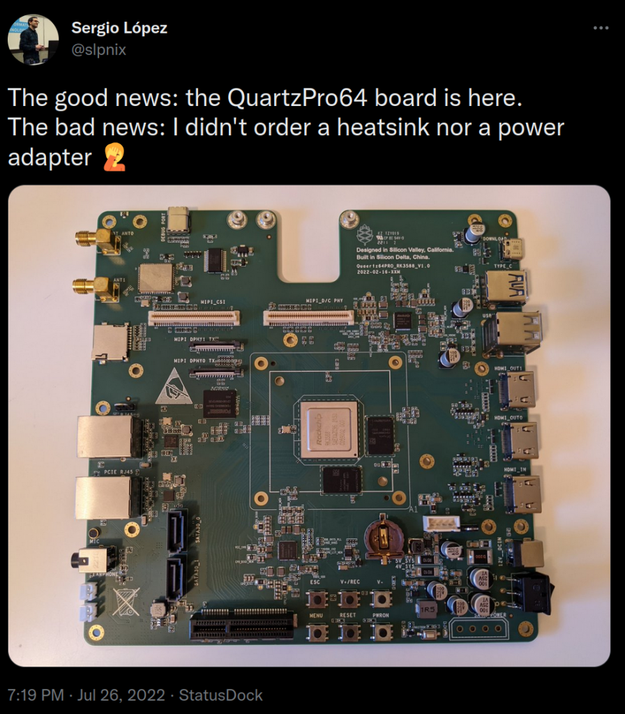 Before I get into some of the Quartz64 news, I would just like to mention that the first batch of QuartzPro64 boards have gone out to developers. I was glad to learn that the first round of developers have already received their boards and began working on supporting the platform. This was the first dispatch of QuartzPro64 and many more are yet to come. We have received a good response from the development community and the boards sent out earlier this month have found their way into the hands of very skilled developers. We are, however, still actively seeking the best possible candidates for these early development boards, so if you are someone who could contribute to the bring-up process of the RK3588 then make sure to submit your application to purchase a dev unit at half the price.