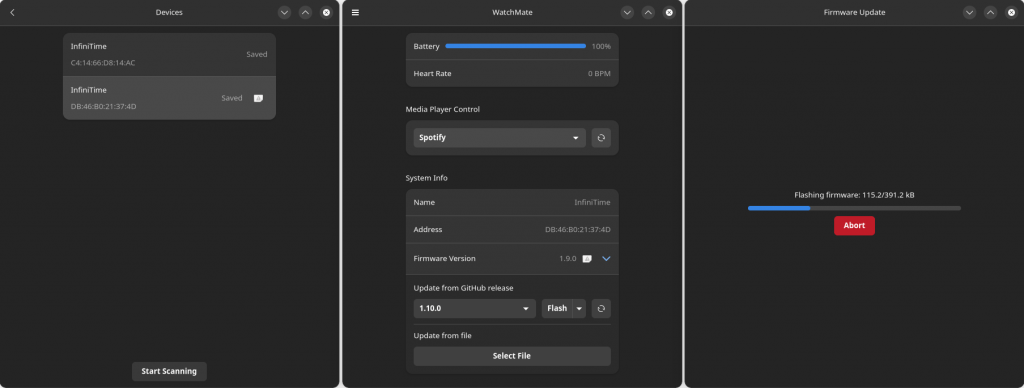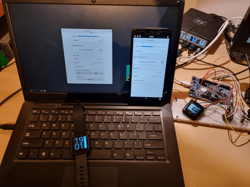 This month, we welcome a new companion app in the PineTime ecosystem: watchmate. The author announced it on Twitter and Mastodon a few days ago. Watchmate is a companion app which runs on desktop and mobile Linux and is compatible with PineTime running InfiniTime. Written in Rust and based on libadwaita and BlueR it already supports many features from InfiniTime, such as setting the time, reading battery level, recording the heart rate value, controlling media player and OTA firmware updates.