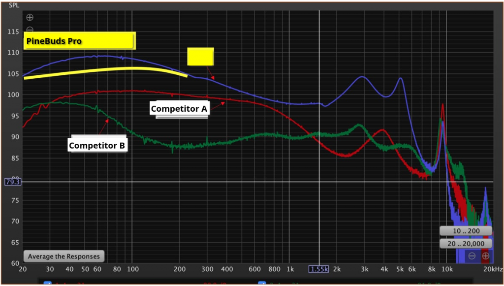 I should mention that the PineBuds Pro had extensive sound tuning - the hardware was tested and molded to provide the best-possible sound. We reached out to professionals in the field to tune the plastics and the speaker to offer what we believe to be the best sound signature. I am not exactly well versed in the process nor do I have any real insight into what good frequency responses are for this type of IEMs, but for those of you who are in-the-know I am including a graph below which you are welcome to study. If you’re an audiophile, please share in the comments what this graph means to you.